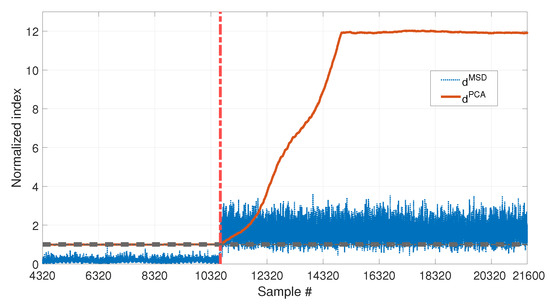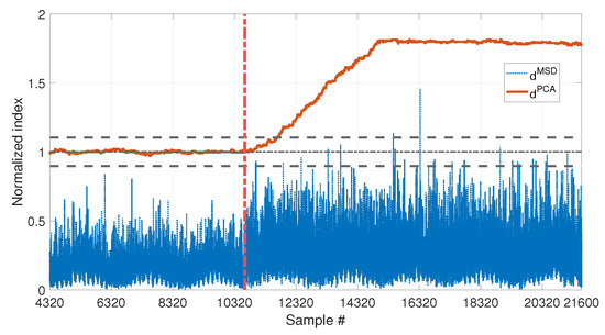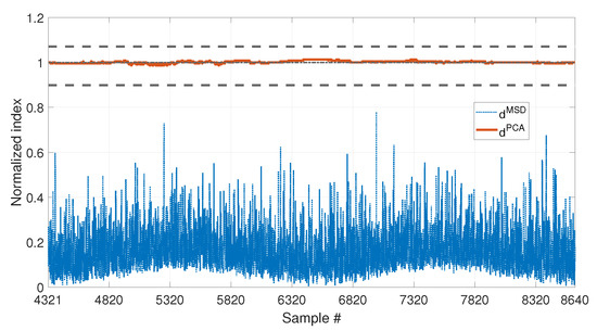 A difference between the new PCA-based approach and the MSD-based one is that compares a single observation with the baseline set, while requires a set of new samples to be assembled with the baseline matrix . Thus, after the baseline data set, each time a new observation of the damage feature is available, the matrix will be increased of one row, until the number of new observations is equal to n. From that moment onward, the matrix will always have size , meaning that, every time a new observation is available, it is included in and the least recent one is discarded, proceeding as a travelling window.