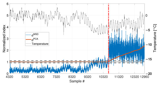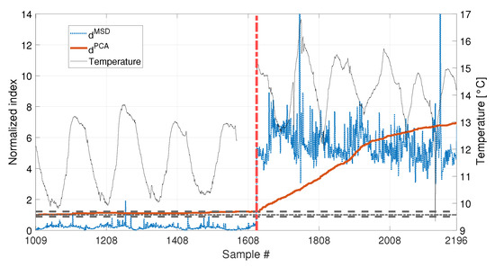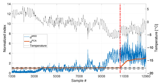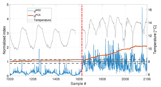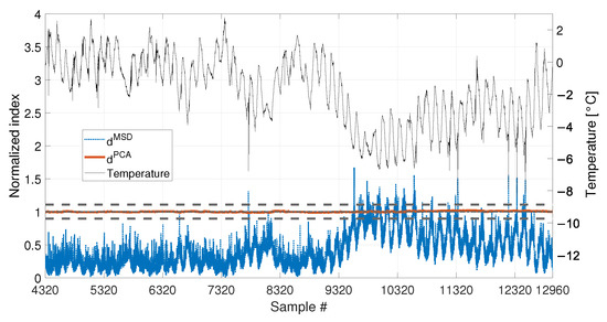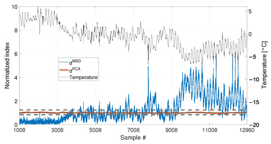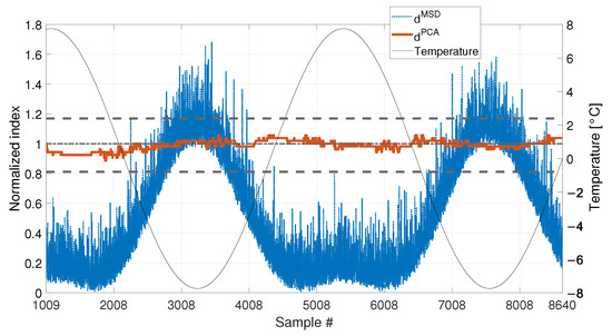 As for the PCA-based strategy, the effects of temperature on the variance of is retained by the first two PCs. They indeed show deterministic trends and, thus, were removed from the damage feature. The proposed procedure proved to be able to effectively filter out the temperature effect, as it can be seen from Figure 23 and Figure 24. Indeed, does not show any temperature-correlated trend (compare the red and black curves) and, when no damage is present, it does not exceed the range limited by and .