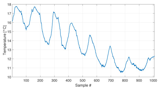 A set of 1008 samples is used to define the baseline matrix (i.e., ), composed by the experimentally identified eigenfrequencies for the first four vibration modes (see Section 2.3.2). Considering that an estimate of the four eigenfrequencies is available every 10 min, the baseline set includes 7 days. The temperature trend related to the baseline set is reported in Figure 22, and the temperature trends of the validation and damage sets are reported in the following Figure 23 and Figure 24, together with the damage indexes. It is noticed that, in all the figures related to the experiments, the temperature T is plotted in place of . The gap of temperature data noticeable in Figure 23 and Figure 24 is due to missing data caused by a malfunctioning of the temperature sensor. As it is possible to observe, the daily temperature cycles can be clearly noted. Furthermore, a drift in the daily mean temperature is also present. The available baseline set approximately covers the range of temperatures 10.5 to 17.5 °C.