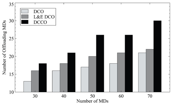 First, we reveal the numbers of offloading MDs for the numbers of MDs in the different schemes in Figure 3. The scheme L&E DCO considers the ratio between edge and local computing to outperform the algorithm based on original game theory (DCO). The results show that it uses about 23% additional offloadings for 30 MDs as compared to DCO. However, our scheme, DCCO, can further increase the number of offloading MDs by 38%. It is apparent that DCCO outperforms both DCO and L&E DCO because of the additional MD clustering. The interference received by each MD is reduced, since the MDs in the same channel are eliminated. DCCO thus enables more MDs to offload tasks to the MEC server.