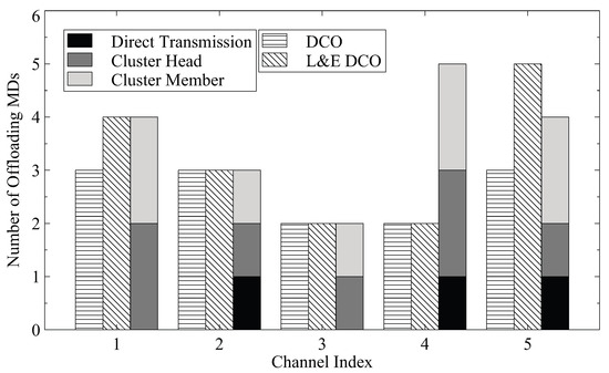 We also show the number of MDs in each channel for the scenario with five channels and 30 MDs in Figure 5. The numbers of cluster heads and members for the proposed DCCO algorithm are also depicted. The results suggest that the additional offloading MDs can be achieved by MD clustering. Since the cluster members do not communicate with the basestation directly, the interference received by the mobile devices can be reduced to improve the transmission performance.