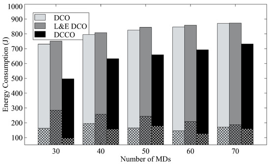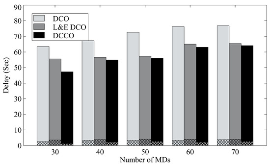 Figure 7 shows the average delay for finishing tasks from mobile devices for different numbers of MDs. The delay in the results also includes the latency for both transmission and execution, where the mesh bars depict average transmission delay. In the case of 30 MDs, it can be observed that the proposed algorithm has the shortest delay. With the DCCO algorithm, we can reduce response delay by about 20% as compared to DCO.