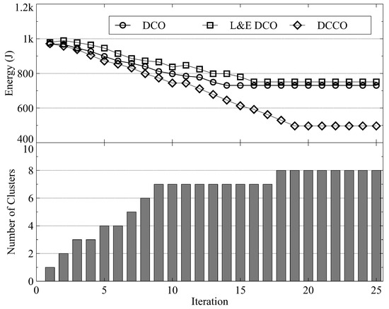 Figure 8 and Figure 9 present the number of iterations for convergence with 30 and 70 MDs, respectively. In both figures, the upper half shows the energy consumption and the lower half shows the number of MD clusters. We observe that within 20 iterations, all schemes can reach Nash equilibrium. Although the proposed DCCO algorithm reaches the Nash equilibrium with more iterations than the other two algorithms, it also reduces the average energy consumption by increasing the number of clusters and offloading MDs. Figure 9 shows that about 35 iterations are required to reach Nash equilibrium. The results show that the convergence time is sublinearly related to the number of MDs. As a result, the proposed algorithm provides scalability for scenarios with numerous MDs.