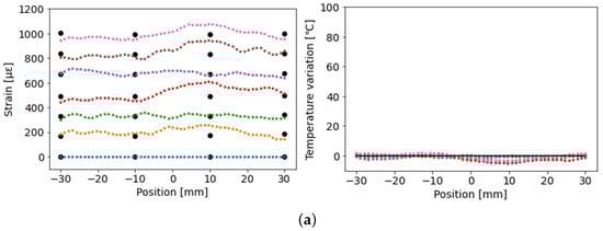 Figure 8 presents the strain and temperature distributions measured by combining F1, F2, and F4. Position zero corresponds to the center of the specimen. The black dots in the strain distribution graph represent the values measured by using the strain gauges. The black line in the graph of the temperature distribution represents the average value measured by the four thermocouples. It was inferred that uniform strain and temperature distributions were measured over a 60 mm section, which agreed well with the values of the strain gauges and thermocouples.