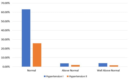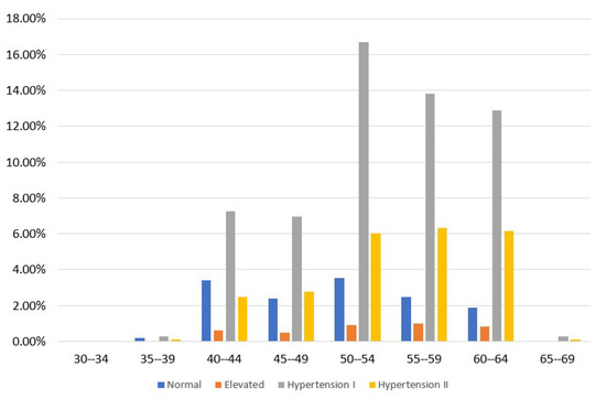 Moreover, Figure 1 isolates the CVD class and presents the distribution of the relevant instances concerning gender and blood pressure categories. Women with hypertension prevail against men, meaning that the former are more prone to occurring hypertension and CVD than the latter. Figure 2 demonstrates the distribution of participants per blood pressure category [45,46] and age group only for those who have been diagnosed with CVD. As we see, hypertension mainly concerns those older than 50 years, while a small portion of participants, 6 to 10%, occurs in the 40–44 and 45–49 age groups.