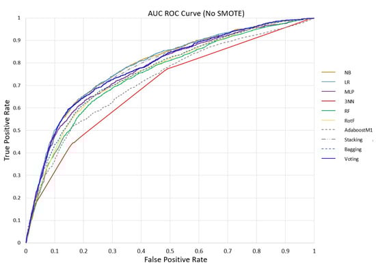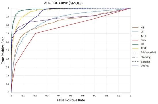 Regarding the AUC, percentages equal to or greater than 94% were achieved by RotF with 91.9%, Stacking with 92.1%, Voting with 91.7% and Bagging with 90.9%. Finally, for further validation of the models’ evaluation, in Figure 4 and Figure 5 we plot the AUC ROC curve of the proposed machine learning models without and with SMOTE, where the Stacking technique’s superiority is confirmed.