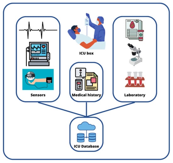 The database collected demographic data, vital sign measurements made at the bedside (1 data point per hour), laboratory test data, procedures, medications, caregiver notes, imaging reports, signals (electrocardiography (ECG), photoplethysmogram (PPG), arterial blood pressure (ABP)), etc. It contains the variable to be estimated in this work (LoS in the ICU) with a resolution of ± days (±8.64 s). Figure 1 shows the different data sources of an ICU. The detailed structure of the database can be found in the MIMIC-III original publication [].