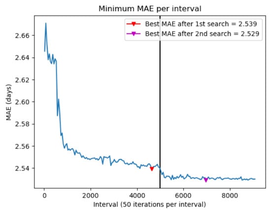 The whole evolution of interactions of both optimization steps are plotted in Figure 3, which shows the minimum value of the MAE obtained (grouped into intervals of 50 iterations), that clearly shows the downward trend. The figure also shows how after redefining the search space from the results of the first search step (black vertical line), there is a sharp drop in the value of the MAE, obtaining a minimum value of 2.529 in iteration 6962.