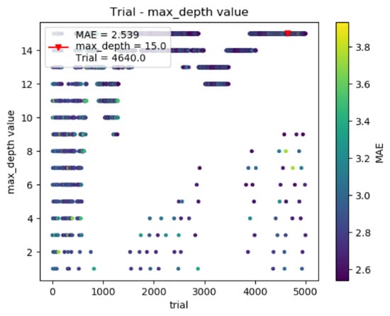 Another important element when analyzing the optimization stage of the model is the evolution in the search, that is, how the values of the hyperparameters vary throughout the different trials. Figure 4 shows the value of one of the model hyperparameters (the maximum depth) in each trial, with its corresponding MAE. The figures corresponding to the rest of the hyperparameters are shown in the Supplementary Materials. From these figures, what was indicated above can also be seen, meaning that there is no direct correlation between the value of the individual hyperparameter and the value of the MAE obtained. However, it shows that the intervals between the optimal MAE value obtained and the trend in the search are found. From these results, a second optimization step was performed by redefining the search space of the Bayesian model, modifying the search space limits. After this second optimization step, a MAE of 2.529 was obtained.