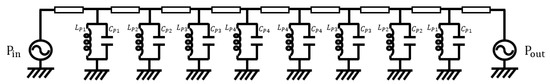 Figure 1 has eight parallel LC resonators cascaded through transmission-line segments as coupling elements. Equation 1 is the transfer function of the curve fitting the amplitude. The long expression is decomposed into a few terms. The maximum order of the denominator of t(s) is the same as the number of the resonators. As is performed for filter designs, the transmission-line segments or waveguide sections of nearly a quarter wavelength work as an inductor mentioned in [14] and are put between the resonators for the bandwidth. In the PCB filters and waveguide filters, the LC resonators seen in Figure 1 are changed to the distributed elements, the lengths of which are half wavelength and odd multiple half wavelengths. This is the conventional rule that is most often used, thanks to its simplicity and convenience. If and only if this rule is kept, the bandpass filter will end up with a long structure when a higher-order filtering is required, like the specifications in Table 1. The configuration of Figure 1 with the parallel LC resonators leading to conventional resonators is modified into something with new resonators as follows.