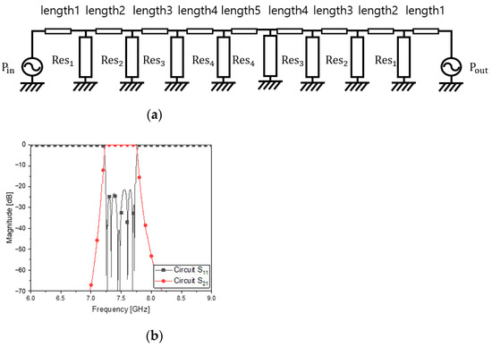 The resonators of Figure 2a will be filled with new ones. By satisfying the requirement, the circuit calculation gives the unknowns in Figure 1 and Figure 2 and the values in Table 2. Figure 2b presents S11 as the reflection coefficient and S21 as the transmission coefficient of the device. This ideal circuit results in the satisfactory frequency response. The circuit calculation is operated on the basis of the following mathematical procedures.