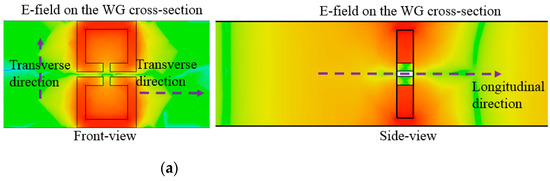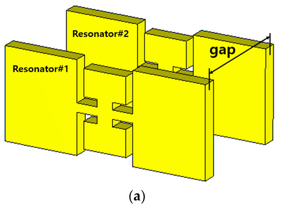 In the area of the conventional passive components, they resonate at the half-wave-long TX-line segment, and when becoming much shorter than the half wavelength, they are not resonant but evanescent. The field is strongly resonant on the structure that is far shorter than the half wavelength, as in Figure 4a. This field is observed at the target frequency. Especially in the side view, there are two vertical bars whose gap is roughly the half wavelength, and the thickness of the proposed resonator is a small fraction of a quarter wavelength. The electromagnetic wave entering the leftmost side (input port) propagates in the longitudinal direction, which is not blocked by this thin structure. Not as the evanescent mode, this propagation mode is consistent with the beta equal to zero occurring at the same frequency in reference of the dispersion diagram. Like the relationship between the beta (propagation constant) and the frequency, the nonlinear curve is formed from the LH (left-hand) region of the negative beta through the ZOR point to the RH (right-hand) region of the positive beta. For the conventional WG bandpass filters, cavities are designed as the half-wave-long waveguide sections for the resonance of interest and cascaded through irises for inter-resonator coupling. Generally, irises as H-plane or E-plane steps are not resonant but rather have reactance. On the contrary to that, the proposed resonator as the subwavelength structure passes the RF signal at the frequency. To generate a certain bandwidth as the passband and roll-off outside the band edges, resonators must be coupled for controlling the number of electromagnetic fields transmitted to the next resonator. This mechanism increases the order of the filter and the steepness of the skirt.