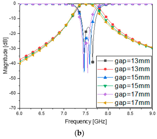Figure 5a is drawn with the geometrical parameters in Table 5. S21 in Figure 5b reveals that the slope of the skirt has been hastened compared to the one-pole case in Figure 3b. The gap length of the coupling element between the resonators is obtained by finding the value that generates the desirable S11 and S21 performances because it is varied, as in Figure 5b. The gap length of 15 mm is proper for the second-order case because the impedance matching S11 becomes worse; the bandwidth increases for a gap length of 13 mm, and the bandwidth decreases for gap length 17 mm. Now the attenuation level in the stopband is around 10 dB. To have higher attenuation at the stopband, the structure is extended to the eighth-order filter.