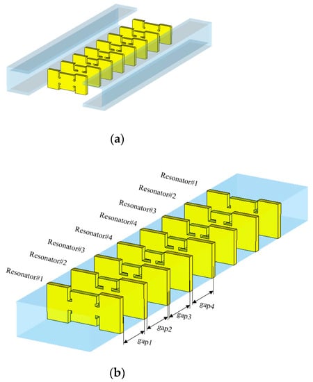 The resonators are placed in series through coupling elements, as quantified in Figure 2 and Table 2. The coupling elements are denoted as lengthi for the eighth order of filtering. Prior to the high-order filter, the second-order BPF is built to see the basic characteristics of the coupling element suggested together with the ZORs.
