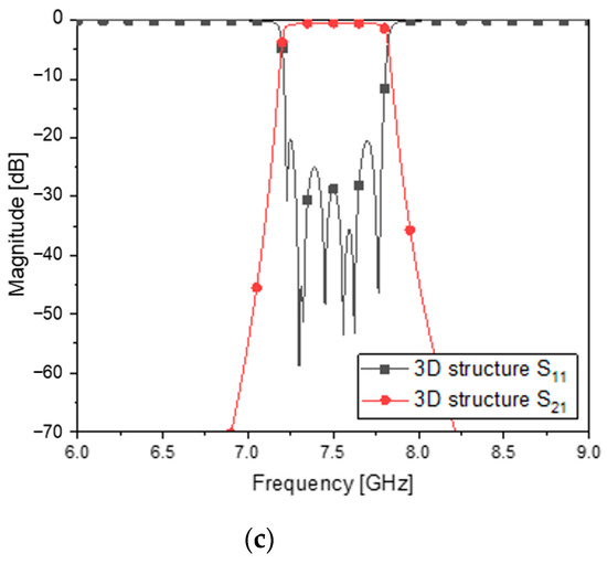 Beyond the two-pole BPF, for assuring a high level of noise suppression at the stopband, eight ZORs are put in order, and adjacent resonators are coupled through lengthij. Figure 6a is an open structure before assembly, and Figure 6b is the complete shape. Giving the values to the variables as in Table 6, the full-wave EM simulation provides the designer with the frequency response of Figure 6c. Excellent impedance matching is peeked through an S11 of −20 dB and the insertion loss of an S21 of −0.9 dB in the passband. Among other things, the attenuation has been improved by a large margin with the steeper skirt. It is 40 dB.