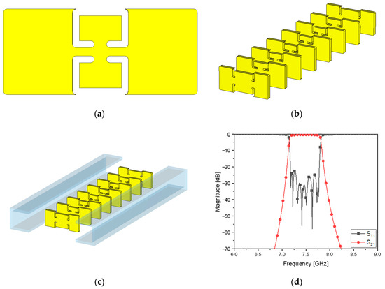 Despite the geometrical change in the front view of the flat metamaterial resonators, it is necessary to keep the frequency response compliant with the specifications. The corners become round and weaken the slot capacitance and the inductance on the edges of the metal patches and their intermediate strip. This means that at a microwave frequency band, it degrades the initial performance of the BPF. In the realistic case, Figure 3c and Figure 6 are rendered as in Figure 7a–c. Some of the physical dimensions have to be fine to be in the unit of 10−2 mm and no courser in order to achieve the required frequency response. Setting up the structure in the electromagnetic analysis software with the values for the geometrical parameters, the transmission and reflection coefficients are obtained as in Figure 7d, which meets the design requirement. This is very different from cavity filters presented by [15,16,17] in terms of shape and length, and it is physically realized as follows: