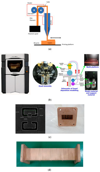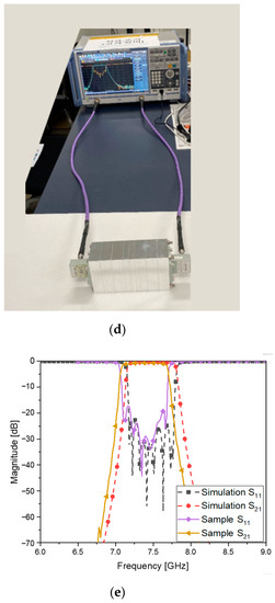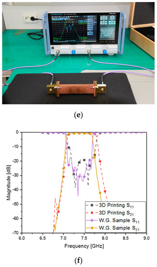 The metallic WG ZOR filter has been transformed to its 3D-printed version, manufactured as in Figure 9a, which was introduced by [18]. Using the 3D printer of FDM shown in Figure 9b, a polymer named PC (Polycarbonate) is additively grown to become the geometry appearing in Figure 9c,d owing to the filament projected by the tip of Stratasys (Fortus 450 mc) [19]. The inner and outer surfaces of the polymer are coated with copper, combined with electroless plating. PC is a superior plastic that has high strength, excellent fracture toughness and better heat resistance compared to conventional plastics, and it uses soluble supports for forming the structure. The produced 3D-printed structure is coated with the combined dry-and-wet fused metal coating process to have electrical properties. To improve the adhesion force, a plasma dry etching is applied to the pretreatment process. Then Pd (palladium) and Sn (tin) as reaction catalysts are used to improve the plating uniformity and adhesion strength of the electroless plating. Inside the rectangular body, the space consists of the ZOR resonators and coupling elements, as in Figure 8a,b. The novel structure is measured as in Figure 9e, whose s-parameters match those in Figure 9f, as the results: the electrical properties that are in good agreement with the CNC-milling-based WG BPF comply with the requirement. A small-scale error occurs, such as the upwards expansion of the upper band edge. It is assumed that the central resonators, such as numbers four and five, have the slots of the cross section disturbed by the surface roughness of the polymer and the discrepancies in width, length and thickness as blobs. Instead of one-round manufacturing, experiences in finding the right conditions for selecting the material, for positioning the tip, for the heat, for the density and for the time accumulated from repeated manufacturing will make the implementation better. Around 1362 g of the aluminum WG ZOR BPF has been lowered to approximately 54 g in the 3D-printed version. Both of the novel prototypes of the eighth-order bandpass filters are attractive to the placement in LEO satellites and microsatellites.