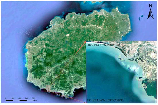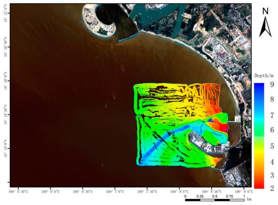 This experiment was conducted in a portion of the sea area (18°18′30″ N, 109°7′00″ E) of Nanshan Port, Yazhou District, Sanya City, Hainan Province. As shown in Figure 1. Although the water depth does not exceed 20 m, the water quality in this area is poor. Therefore, it has a certain reference value for the extensive practice of obtaining water depth using remote sensing images.