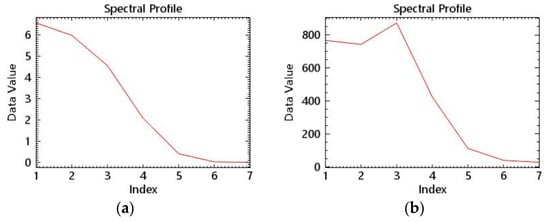 After acquiring the remote sensing image data, we performed radiometric calibration, which is the process of converting the digital value (DN, Digital Number, also known as digital quantization value) recorded by the sensor into absolute radiance using a rational function model []. The process of converting the radiance at the top of the atmosphere to surface radiance is known as atmospheric correction. The primary goal of atmospheric correction is to reduce atmospheric scattering and reflected energy received by satellite sensors, while obtaining as much real surface reflectivity information as possible. The FLAASH model is used in the experiment for atmospheric correction. There are numerous advantages to using the FLAASH atmospheric correction module. (1) It is very friendly to multi-spectral remote sensing data and can process multi-spectral data well; (2) The algorithm is highly accurate; the model employs the MODTRAN5 radiative transfer model, which is more accurate than the look-up table method. (3) Different correction models are available for different regions, and the corresponding atmospheric model and aerosol model can be chosen based on the region, etc. []. Therefore, the FLAASH module is used in this paper to perform atmospheric correction on satellite images. The spectral curve of the same water area before and after atmospheric correction is shown in Figure 4.