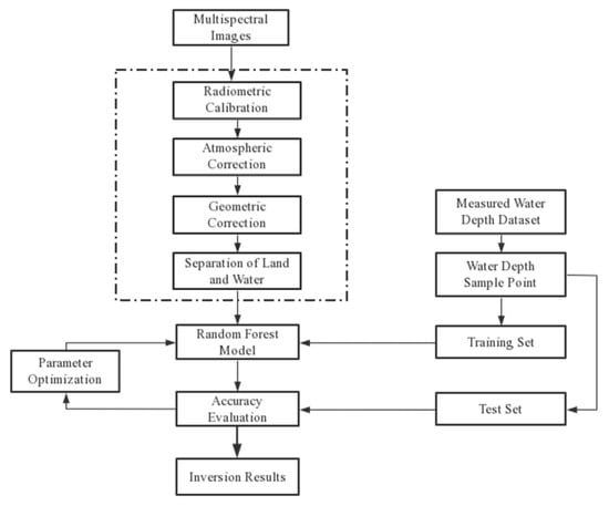 Flow chart of multi-spectral remote sensing data water depth inversion technology.