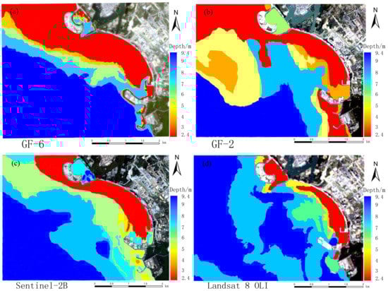 Inversion of water depth map by random forest model of a multispectral image: (a) GF-6; (b) GF-2; (c) Sentinel-2B; (d) Landsat 8 OLI.