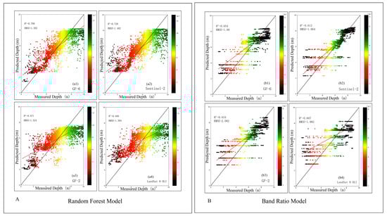 Correlation between water depth inverted by different images of different models and measured water depth: (A) is Random Forest Model, (a1) GF-6, (a2) Sentinel-2B, (a3) GF-2, (a4) Landsat 8 OLI; (B) is Band Ratio Model, (b1) GF-6, (b2) Sentinel-2B, (b3) GF-2, (b4) Landsat 8 OLI.