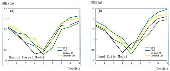 RMSE by different methods, different images, and different water depth range: (a) Random Forest Model; (b) Band Ratio Model.