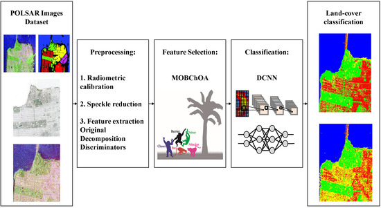 In this paper, a DL approach was used as a supervised classification method. Figure 1 shows the research method’s flowchart, which consisted of four major steps. The first step involved performing the necessary preprocessing, which included radiometric calibration, speckle-noise reduction, and feature extraction from POLSAR images as well as generating test and training samples. In the second phase, the proposed MOBChOA was evaluated using two real-world benchmark problems. Then, the proposed MOBChOA-DCNN approach was implemented to select the optimal features. In the third step, the DCNN architecture was applied for land-cover classification (with optimal features selected from MOBChOA). Finally, the classification results were generated as a labeled map.