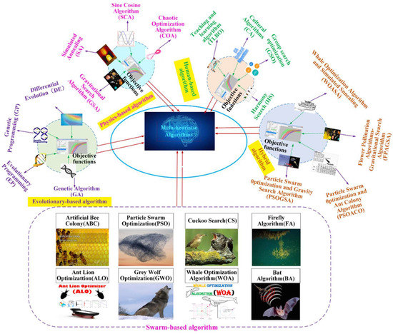 Figure 3 shows the main categories of meta-heuristic algorithms: evolutionary-based algorithms, swarm-based algorithms, physics-based algorithms, human-based algorithms, and hybrid algorithms. Since a few decades ago, a few nature-inspired meta-heuristic algorithms, such as simulated annealing (SA), differential evolution (DE), the genetic algorithm (GA), ant colony optimization (ACO), and particle swarm optimization (PSO) have been introduced and used for optimization problems. Afterward, many studies concentrated on the modification of these algorithms for new applications. Other researchers tried to introduce new meta-heuristic algorithms by taking inspiration from nature. Some newer algorithms such as the chimp optimization algorithm (ChOA), the crystal structure algorithm (CryStAl), red fox optimization (RFO), the honey badger algorithm (HBA), and the gannet optimization algorithm (GOA) are the results of such efforts [35,36,37]. In this paper, a new binary version of ChOA is proposed for the feature selection problem.