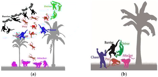 Hunting process in ChOA. (a) First phase: exploration, which consists of blocking, driving, and chasing the prey; (b) Second phase: exploitation, which consists of attacking the prey.