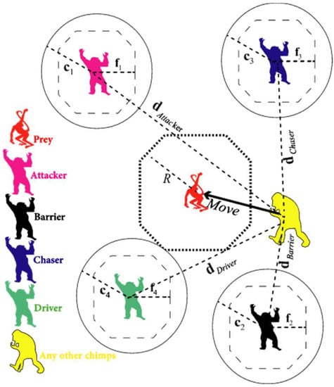 where presents the best search agent, is the second-best search agent, denotes the third-best search agent, is the fourth-best search agent, and is the updated position of each chimp (Figure 5).