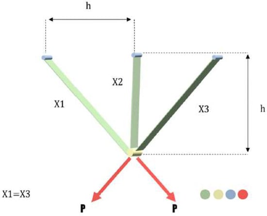 The three-bar truss problem is a widely used real-world engineering optimization problem. The three-bar truss problem intends to find the minimum weight of a three-bar truss. A schematic view of the problem is shown in Figure 9 and can be formulated as Equations (19)–(23) [43]: