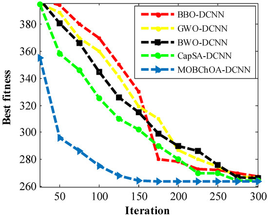In this paper, a new transfer function was proposed to map continuous space to discrete space. The transfer function characterizes the probability of changing the position vector elements from 0 to 1 and vice versa. The transfer function compels chimpanzees to move in discrete space. Therefore, it helps the algorithm to avoid being trapped in local minimums. According to the results, the proposed MOBChOA-DCNN method was useful for image classification. Figure 16 shows the convergence trends of the architectures. As shown in this figure, the MOBChOA-DCNN and CapCA-DCNN architectures converged faster than the others. Moreover, MOBChOA-DCNN achieved high stability and a high convergence speed in fewer epochs. The reason for MOBChOA’s superiority is the existence of three operators: (a) exploration, which consists of blocking, driving, and chasing the prey; (b) exploitation, which consists of attacking the prey; and (c) a new transfer function to map the continuous space to discrete space.