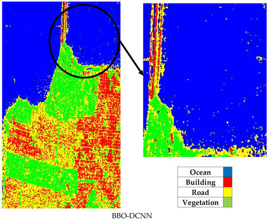 As shown in the classified images, MOBChOA-DCNN accurately detected the building and ocean classes. In Figure 11b–e, some ocean pixels were misclassified due to the appearance of waves and speckle at the sea surface. Figure 12 shows these misclassified pixels. However, in MOBChOA-DCNN, the ocean class was well identified. According to the ground truth samples and classified images (Figure 11), there were some flat surfaces inside the vegetation that were not roads (in the center-left of the classified images). Figure 13 shows these flat surfaces within the vegetation. The road pixels also had a flat surface. The flat surface scattering mechanism in POLSAR images is double-bounce. For this reason, those flat surfaces were considered double-bounce scattering (road class), and MOBChOA-DCNN detects these areas accurately.