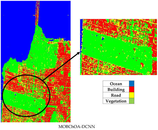 Figure 11 shows the images classified by MOBChOA-DCNN, CapSA-DCNN, BWO-DCNN, GWO-DCNN, and BBO-DCNN. On the left side of the study area, the results indicate a low-density urban area, and on the right side of the study area the results indicate a high-density urban area. According to Figure 11, the classified images based on the Pauli RGB image, the high-resolution image, and the ground truth samples were accurately identified.