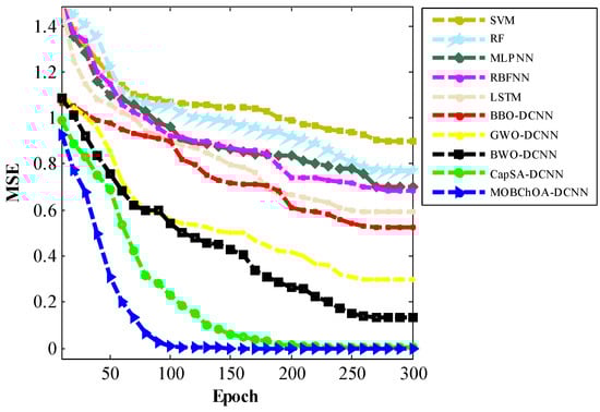 Table 7 provides a comparison of the architectures according to mean square error (MSE) criteria. MOBChOA-DCNN had a smaller MSE than the other architectures. The MSE function can be calculated using Equation (27), where is the total number of samples, is the system output, and shows the desired value: