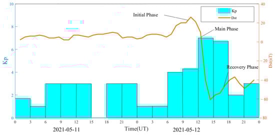 Geomagnetic indices are usually used to describe the overall level of geomagnetic activity, and the intensity of geomagnetic disturbances in a certain period observed by certain spatially distributed stations is used for classification. In this paper, we use geomagnetic indices Kp and Dst to describe the intensity of the geomagnetic storm. Kp index is a widely used geomagnetic index, which mainly reflects the global average geomagnetic activity intensity and takes a value every three hours, ranging from 0 to 9. The Kp index can be generally classified into 28 levels: 0, 0+, 1−, 1, 1+, …, 9−, 9. The Dst index can be used to characterize the complete process of a geomagnetic storm from its occurrence to its end. According to the classification criteria of Loewe and Prölss (1997), −50 nT < Dst ≤ −30 nT is a weak geomagnetic storm, −100 nT < Dst ≤ −50 nT is a moderate geomagnetic storm, −200 nT < Dst ≤ −100 nT is a strong geomagnetic storm, −350 nT< Dst ≤ −200 nT is a severe geomagnetic storm, and Dst ≤ −350 nT is a great geomagnetic storm. The stronger the geomagnetic storm, the more intense the geomagnetic disturbances and the greater the hazard caused by the geomagnetic storm [].