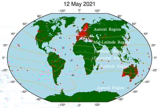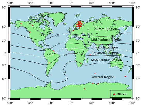 As seen in Figure 11, we found that most of the PAS anomaly sites are concentrated in western Europe, and sporadic BDS sites are distributed near North America, South America, Africa, and Antarctica. According to the latitudes of the geomagnetic field, we also found that the BDS sites affected by the geomagnetic storm are mainly located in auroral regions and equatorial regions of the geomagnetic field. The number of sites in auroral regions is significantly higher than those in equatorial regions. For the polar regions, because the polar ionospheres are the key regions in the solar-terrestrial energy coupling process, and various dynamical processes caused by the solar wind-magnetosphere interaction can directly affect the polar ionosphere, causing numerous plasma processes in the polar ionosphere such as storm-enhanced density, the tongue of ionization, polar cap patches, auroral blobs, and auroral precipitation might have serious effects on BDS signals (e.g., [,,]). For the equatorial region, the classic “fountain effect” is responsible for the Appleton anomaly, thus the ionospheric electron density in the geomagnetic equatorial regions is higher than the middle latitude regions. In addition, the ionospheric plasma bubbles or plumes, resulting from the collisional plasma Rayleigh–Taylor instability, could produce smaller-scale ionospheric irregularities responsible for both amplitude and phase scintillations and/or loss of satellite signals in L-band (e.g., [,]).