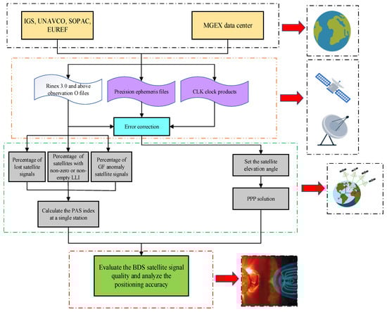 First, the original GNSS observation files containing the BDS signals are downloaded from the websites of IGS, UNAVCO, SOPAC, EUREF, etc., and the corresponding precision ephemeris files and clock products are obtained from the MGEX data center. Then, the percentage of lost satellite signals (), the percentage of LLI (), and the percentage of anomaly satellite signals () are utilized to calculate PAS based on the observations of a single station. On this basis, the PPP positioning solution of the abnormal station is performed, and the error analysis is conducted. Finally, the observed signal quality of global BDS during geomagnetic storms is evaluated and then its influence on positioning accuracy is analyzed, and the relationship models between the PAS index and the geomagnetic storm indices Kp and Dst are established. The complete data processing flow is shown in Figure 3.