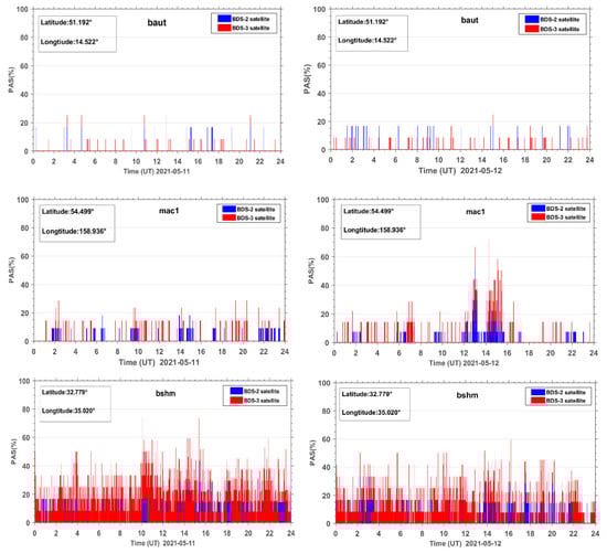 Time series of PAS for BDS3 sites worldwide during the reference day (11 May 2021) and the geomagnetic storm day (12 May 2021).