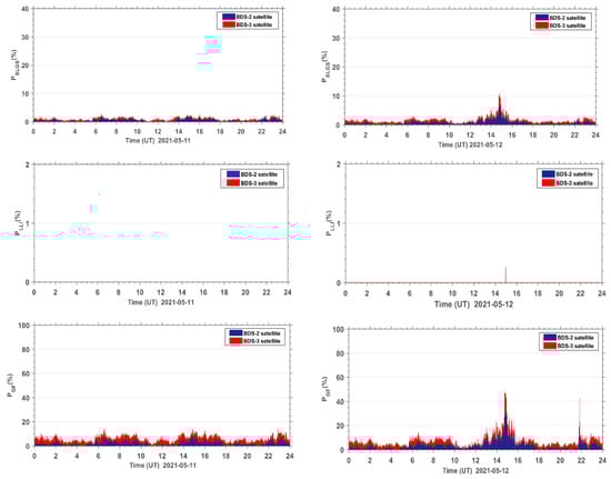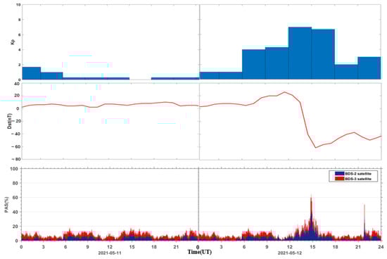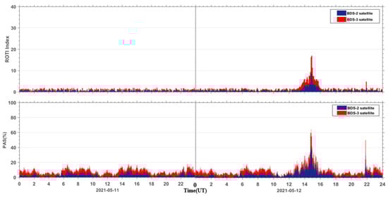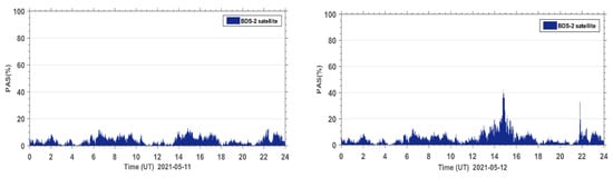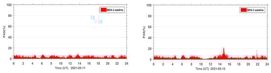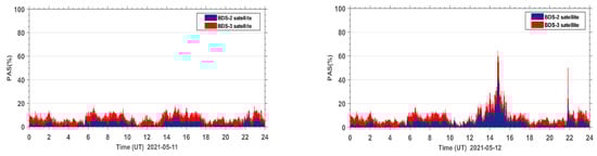 The PAS index of all affected sites during the reference day on 11 May 2021 and the geomagnetic storm day on 12 May 2021 are accumulated under the same epoch. The PAS time series of the global BDS sites are shown in Figure 5. It can be seen that both BeiDou 2 (BDS2) and BeiDou 3 (BDS3) systems show two anomaly peaks in PAS on the geomagnetic storm day compared to the reference day, corresponding to 15:00 UT and 22:00 UT, indicating that the geomagnetic storm has a significant impact on the satellite signals of both BDS2 and BDS3 systems. The BDS2 and BDS3 are regional and global systems constructed and developed by China. The BDS2 regional satellite navigation system refers to the second generation of the BDS satellite navigation system, which currently has 15 satellites (five GEO satellites, seven IGSO satellites, and three MEO satellites) operating in orbit. The BDS3 global satellite navigation system refers to the third generation of BDS satellite navigation system, with 29 satellites (two GEO satellites, three IGSO satellites, and 24 MEO satellites) currently operating in orbit. Although BDS3 has almost twice the number of satellites as BDS2 on 12 May 2021, we can see that the number of affected BDS3 satellite signals only has a few more affected signals than BDS2. This indicates that the BDS3 system performs much better than the BDS2 system due to BDS3 using an improved satellite signal design.