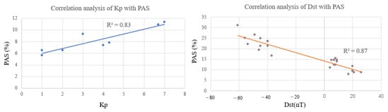 The correlation between the geomagnetic indices Kp, Dst, and the PAS index during the geomagnetic storm day is shown in Figure 10. It can be seen that the correlation coefficient between the Kp index and the PAS index during the geomagnetic storm day is 0.83 and the correlation coefficient between the Dst index and the PAS index is 0.87. It means that the geomagnetic index Kp has a good positive correlation with the change of the PAS index and a good negative correlation with the Dst index.