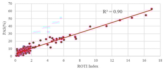 In order to compare the PAS index with the ROTI index, we performed a statistical calculation on the ROTI index for the same stations around the world. From Figure 12, we can see that both the ROTI index and the PAS index are indicative to this moderate geomagnetic storm. We also calculated the correlation between the ROTI index and the PAS index during the geomagnetic storm day. Due to the different sampling intervals for the two indices, the PAS index of each station was extracted at a 5-min interval, same as the ROTI index. As seen in Figure 13, the PAS index has a good correlation with the ROTI index with a correlation coefficient of 0.9.