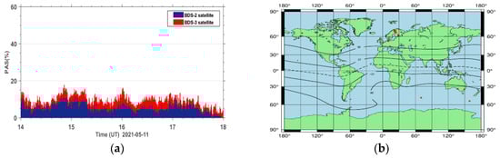 (a) The PAS index during the period of 14–18 h on 11 May 2021 and (b) the global distribution map of BDS sites affected by ionospheric irregularities in the geomagnetic auroral regions.