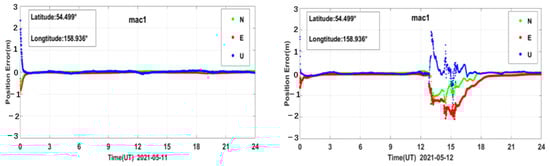 PPP generally refers to a high-precision positioning technique using a dual-frequency GNSS receiver with pseudo-range observations, carrier phase observations, and products such as precision ephemeris and satellite clock solutions provided by some organizations, such as IGS [,,]. In this paper, the PPP solution was performed on the BDS data for all the sites around the world during the reference day and the geomagnetic storm day [,]. We used Net-Diff software for PPP calculation, which is developed based on RTKLIB software []. In the solving process, we only used the BDS observations to perform PPP calculation. Its solution strategy adopts the PPP kinematic positioning model, which eliminates the influence of the ionospheric first-order term through the dual-frequency ionosphere-free combination; the PPP solution is performed after modeling and correcting for the errors related to the troposphere, phase wind-up, and antenna phase center deviation, and the positioning accuracy can reach the centimeter level, or even millimeter level [,]. The signal bands used in the single station PPP solution are the same as the bands used in the single station PAS calculation. The PPP error results of all the above-mentioned PAS anomaly BDS sites were analyzed and compared during the reference day and the geomagnetic storm day. We take the site mac1 as an example; the PPP error time series during the reference day and the geomagnetic storm day are shown in Figure 15, other sites are similar.