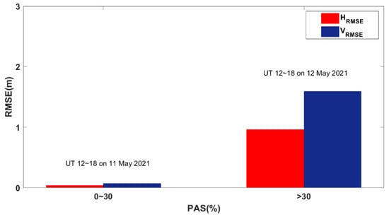 Figure 16 shows the average PPP errors from 12:00 UT to 18:00 UT in the horizontal and vertical directions for all the affected BDS sites worldwide during the reference day and the geomagnetic storm day, respectively. As the PAS index varies from 0 to 30% on the reference day, the corresponding mean value of HRMSE is 0.036 m and the mean value of VRMSE is 0.071 m. As the PAS index increases on the geomagnetic storm day, the mean value of HRMSE and VRMSE increases significantly. The HRMSE and VRMSE are 0.933 m and 1.592 m on average.