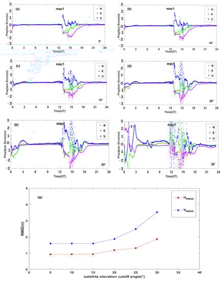(a–f) Positioning error at station mac1 for different satellite elevation cutoff angles; (g) the dependence of PPP positioning errors on different elevation cutoff angles.