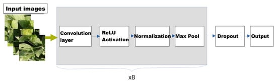 Neural networks [] are popular ML models used for classification. They use one or more layers of functions to produce a classification output. If a neural network with multiple layers uses at least one convolution layer, then the network can be referred to as a convolutional neural network (CNN) []. CNNs perform better in computer vision tasks []. For our neural network, we used DefoNet [] which is a fine-tuned CNN designed to perform well on defoliation recognition. Figure 3 illustrates the architecture of DefoNet. In Defonet, the inputs are images of pixels. These inputs are then passed through 8 convolutional layers all with filters. Layers have varying number of filters (from 32 to 128). After each convolutional layer, there is a ReLU activation function, followed by normalization and pooling layers. Finally, there is a dropout layer before a fully connected layer which gives the output.