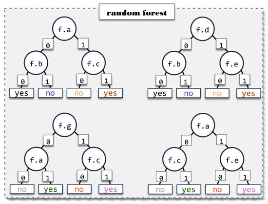 Decision trees [] are ML models that classify inputs by repeatedly separating input samples based on the values of certain features. Decision trees learn these splits by considering potential information gain splitting at each feature. While effective, this method is vulnerable to over-fitting and to noise in the input data. A random forest [] is an ensemble of decision trees in which every tree has access to a different subset of samples and features during training. Figure 4 illustrates an example of a random forest with four decision trees. Features available to the trees are labeled f.a through f.g. Each tree uses a different set of features although they share some commonalities. This example uses binary classification (“yes” and “no”) although the structure can be generalized for more classes, trees and features. During testing, each tree in the forest contributes a vote (the classification of the tree) and results are aggregated to produce a classification for the forest.