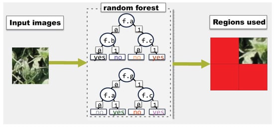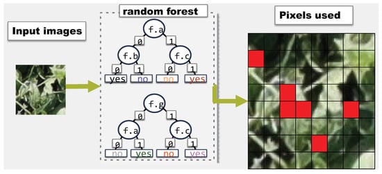 Digital agriculture is the fourth revolution of agriculture, wherein sensors, computation and artificial intelligence (AI) improve crop management, increasing yield. A common objective in digital agriculture is the early detection of signs of pest infestations. Unmanned Aerial Vehicles (UAVs) can fly over whole fields and capture images of crops [,,]. Then, digital agriculture machine learning models can infer crop health from captured images. For example, state-of-the-art neural network [] architectures can recognize defoliated leaves, a sign of infestation, appearing in aerial images []. Neural network models are increasingly common in digital agriculture because they can achieve greater classification accuracy than competing machine learning (ML) models []. However, the process that neural networks employ for classification involves complex, non-linear transformations on a multitude of variables and require large amounts of data inputs []. It is difficult to explain the behavior of neural network models, i.e., why the models label images the way they do. Other ML models, such as decision trees [], use salient features within an image to make predictions. The behavior of these models is easier to explain. Decision trees can also achieve high accuracy in some cases, particularly when using bagging and boosting techniques to create ensemble models [,,,].